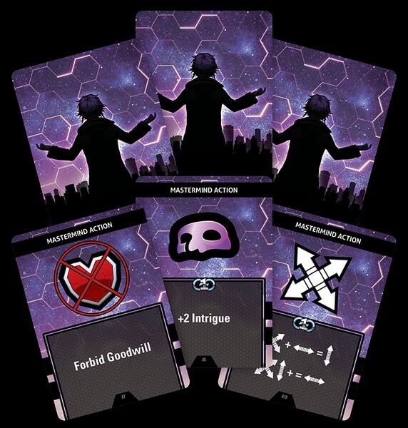 Mastermind có một bộ Thẻ Hành động riêng với mặt sau độc nhất, khác hoàn toàn so với các Nhân vật Chính.