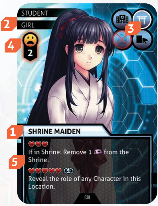 Bảng địa điểm đại diện cho các khu vực trong thị trấn, nơi nhân vật có thể xuất hiện và các sự kiện diễn ra. Bàn chơi bao gồm các Địa điểm (Location) bên phải và một Thanh Dữ liệu (Data Track) bên trái. Bốn Địa điểm thể hiện nơi trò chơi diễn ra: Bệnh viện (Hospital), Đền thờ (Shrine), Thành phố (City) và Trường học (School). Các Protagonists sẽ tương tác với những Địa điểm này trong suốt trò chơi.